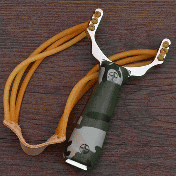 High velocity slingshot. Use rocks, marbles, paintballs, etc to shoot. Cool camouflage painted ergonomic ABS grip. Top aluminium alloy frame, top natural rubber latex and top leather wrapper. Portable size, easily fit into your pocket. Great for outdoor entertainment.