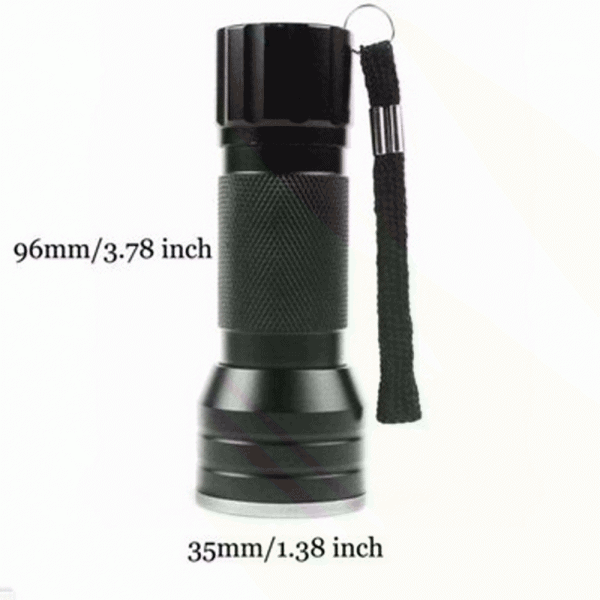 Length aprox. 4″ inches long and the head tip is aprox. 1″ 1/4 wide.. Perfect pocket size… Description: This is an UV ultra violet LED flashlight with 21 LED bulbs. It’s aluminum body makes it light weight and portable. It is perfect for camping, outdoors, around the house and many other uses. The water resistance design is for use on rainy days. The Listing picture features an actual LICE EGG on a strand of hair being made fluorescent by our actual UV Flashlight